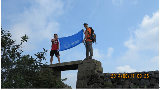 大部队继续前进,胡总监带的小朋友才两岁啊,与我们一样,一路励志,终于全部登上了大岩顶。站在最高处,习习凉风风干了我们的汗水,让我们爽呆了。环顾四周,层层叠叠,绿遍山野。三个水库在不同的方向,镶嵌在丛林中。我们的许大侠和陈大厨爬上了山顶的古村墙,展开了我们的司旗,蓝天白云下,他们象登珠峰的勇士,灿烂的笑容洋溢着纯真。这就是大自然,这就是我们。