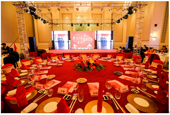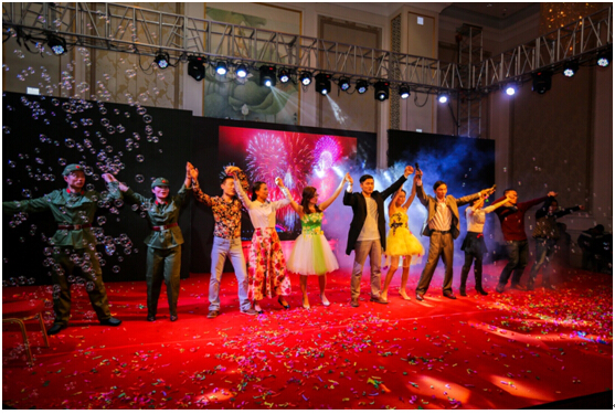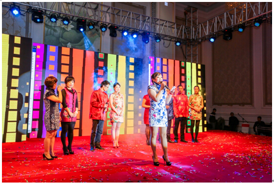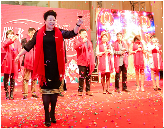 在欢快的音乐声中,首先由李腾副总携各位高管上台给大家拜年。然后,陈美玲董事长宣布“腾飞十年·筑梦滨海”2015迎新春联欢晚宴正式开始,大家举杯同庆,共贺羊年新春的到来。