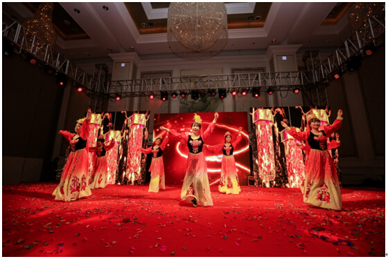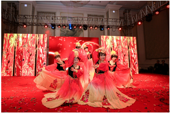 《时代记忆》把现场的气氛烘托的热情高涨,同样似火般激情的新疆舞随后登台,营销部与人事部的美女们共同表演的舞蹈《欢乐的跳吧》让人眼前一亮,色彩鲜明的服装与艳丽的舞台背景相融,炫到眼晕。