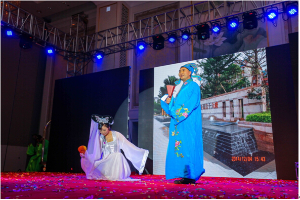 林林副总还真算是我们滨海“娱乐圈”中的才子了,这次晚会的单口相声是他原创,他还给成本部与设计部编排了《时代记忆》,这是滨海地产春节晚会中首次出现情景剧。两个部门的全体成员,通过表演讲述了60年代至00年代的爱情观,节目精致、生动精彩,惟妙惟肖的表演博得了阵阵喝彩。